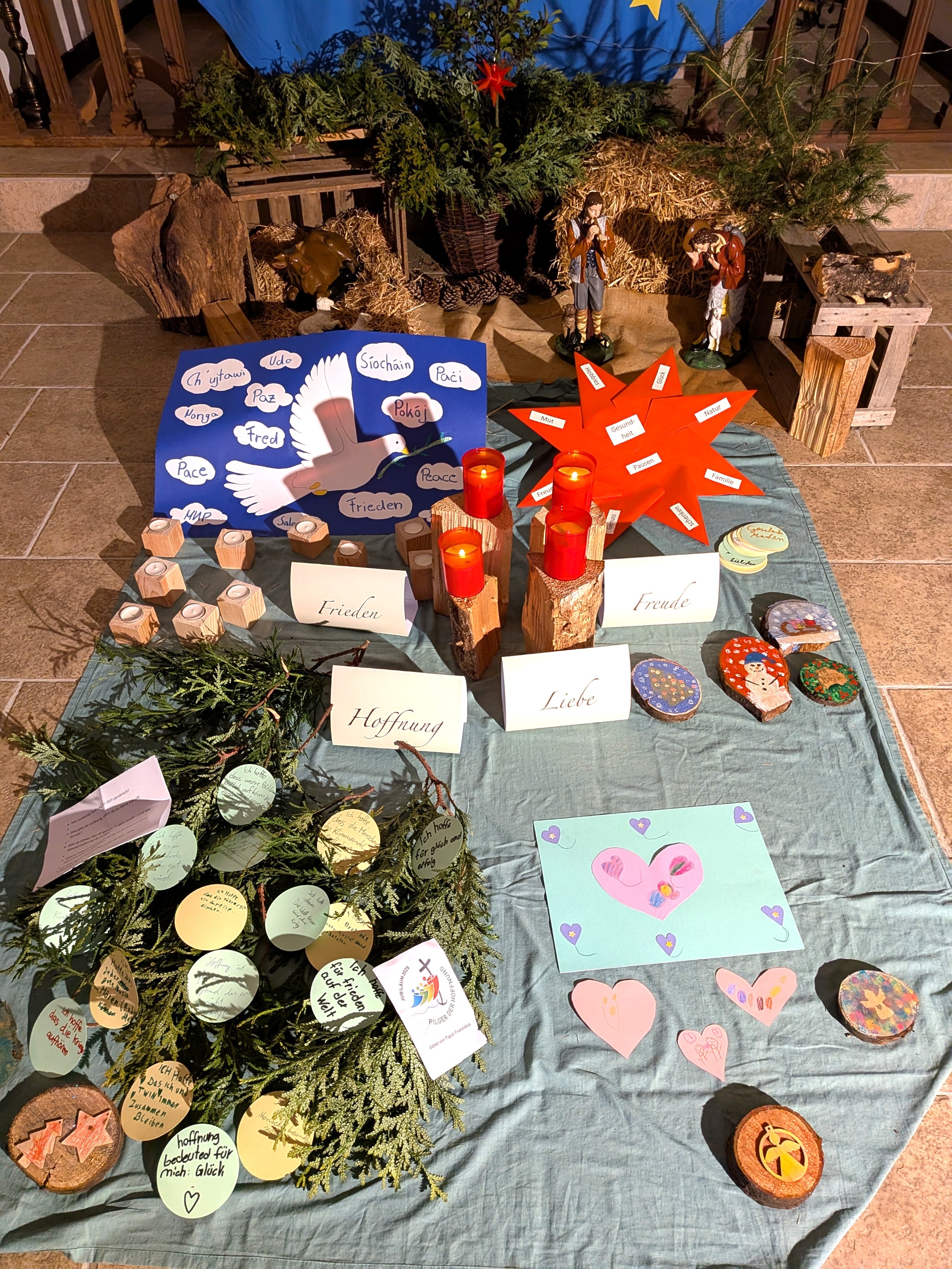 Der Adventskranz bildet den Vorplatz zur Krippe und wird jede Woche thematisch passend weiter ausgelegt.