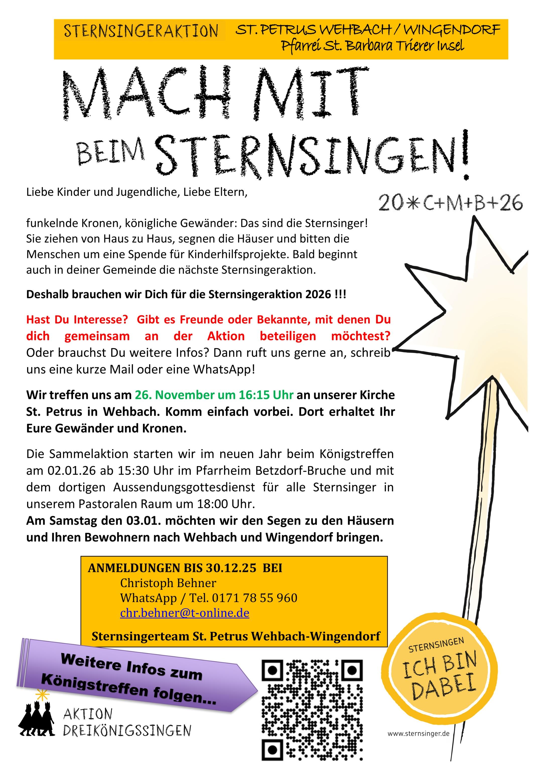Am Samstag den 03.01.2026 möchten wir den Segen zu den Häusern und Ihren Bewohnern nach Wehbach und Wingendorf bringen.