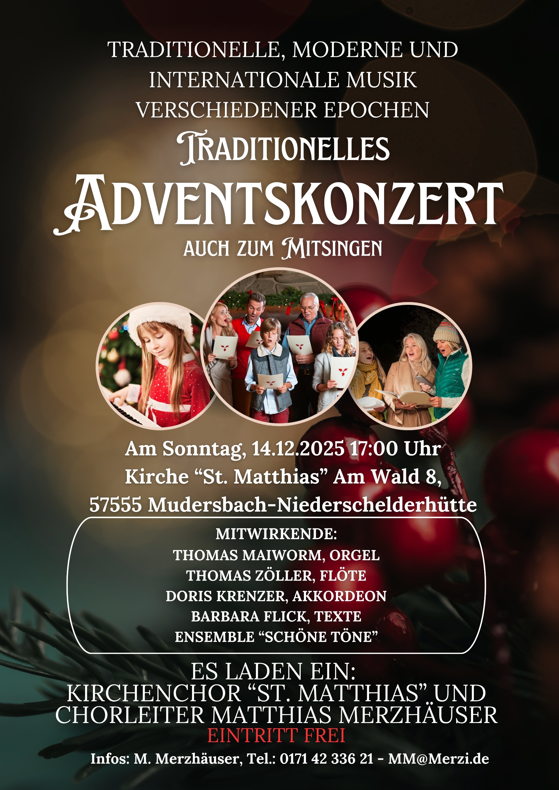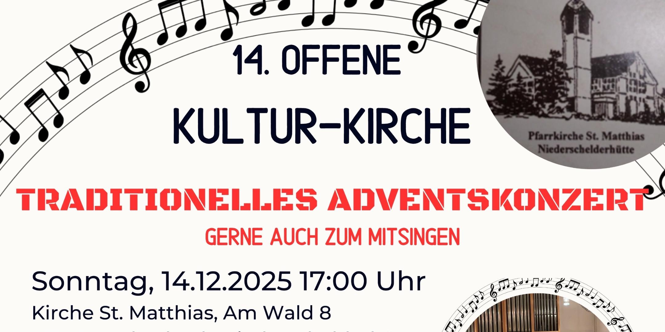 Mudersbach-Niederschelderhütte. Im Rahmen der Veranstaltungsreihe „Offene Kultur-Kirche“ findet auch in diesem Jahr wieder das traditionelle Adventskonzert am dritten Advent, Sonntag, 14.12.2025 um 17:00 Uhr in der Kirche St. Matthias in Mudersbach-Niederschelderhütte (Am Wald 8) statt.