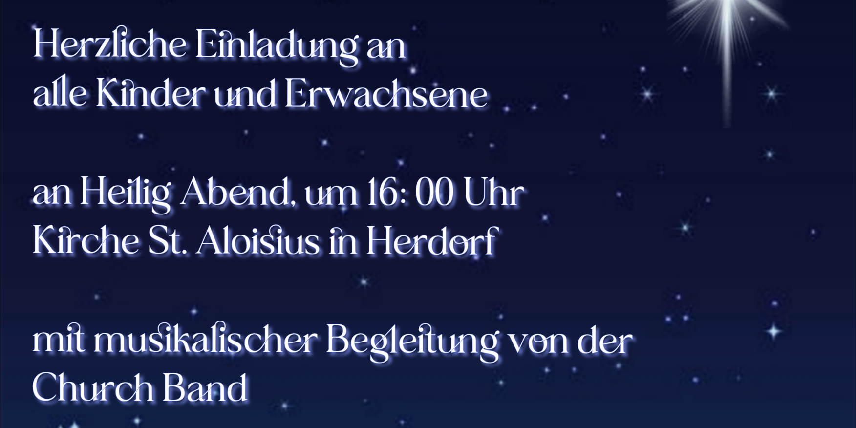 Herzliche Einladung an alle Kinder und Erwachsene an Heiligabend um 16 Uhr in die Kirche St. Aloisius in Herdorf. Musikalisch wird der Gottesdienst von der Church Band gestaltet.