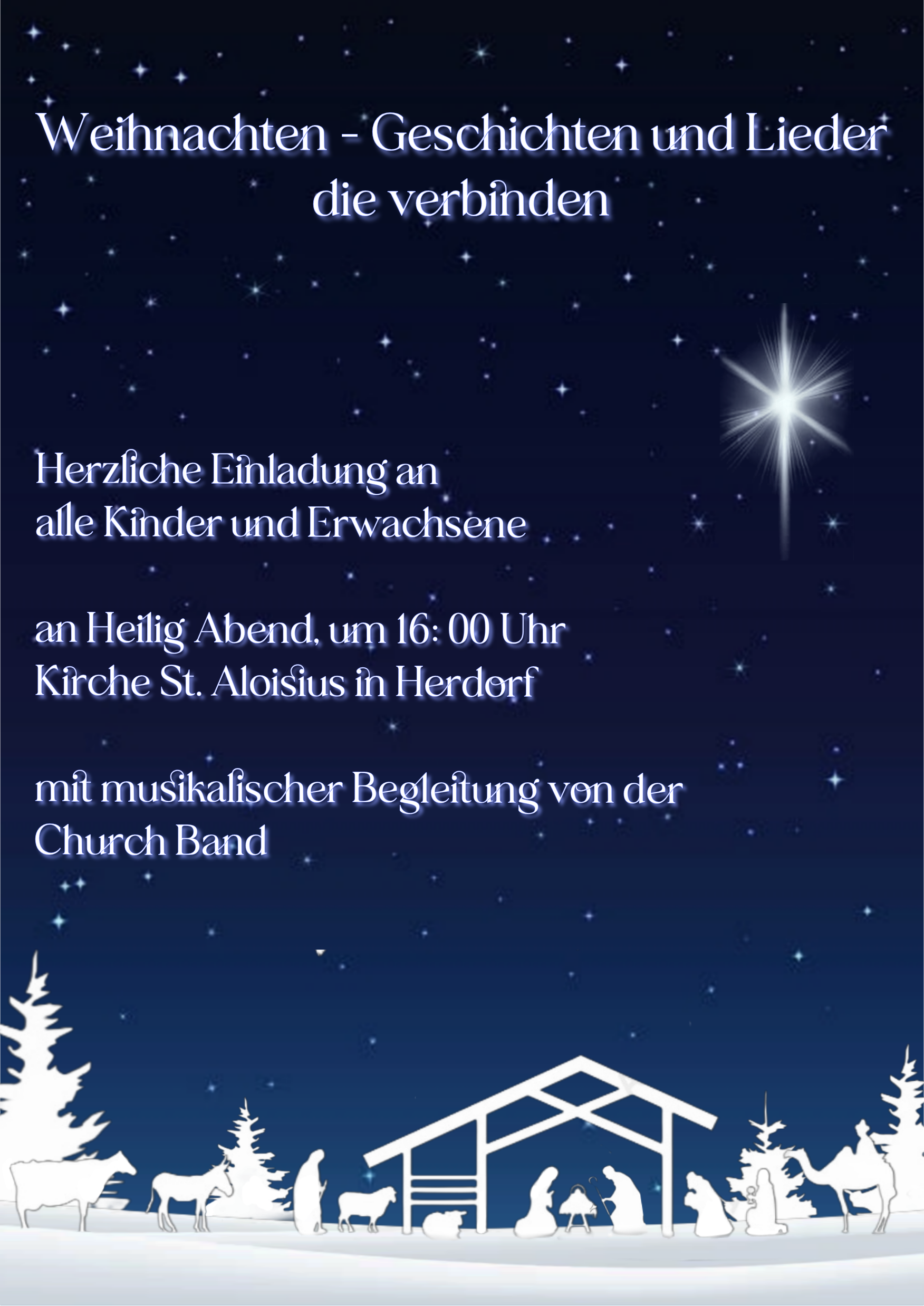Herzliche Einladung an alle Kinder und Erwachsene an Heiligabend um 16 Uhr in die Kirche St. Aloisius in Herdorf. Musikalisch wird der Gottesdienst von der Church Band gestaltet.