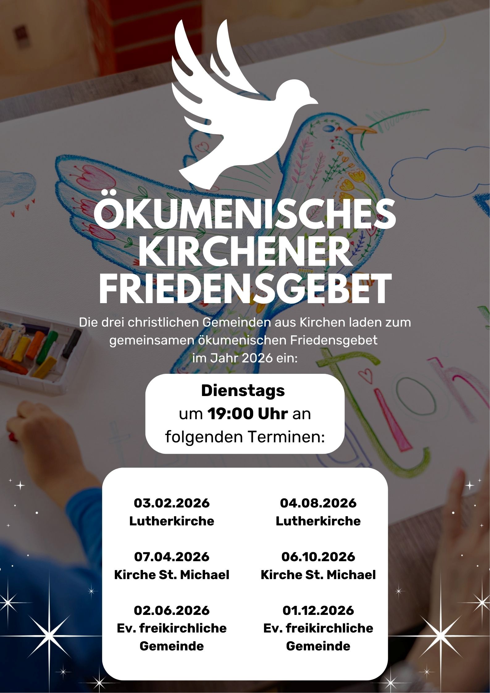 Jeden ersten Dienstag um 19 Uhr, alle zwei Monate, treffen wir uns zum gemeinsamen Gebet für den Frieden abwechselnd in den Kirchen und Versammlungsräumen der Gemeinden in der Stadt Kirchen.